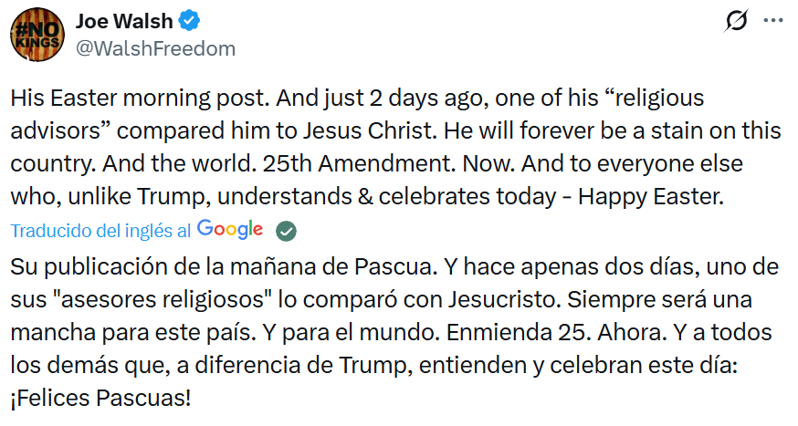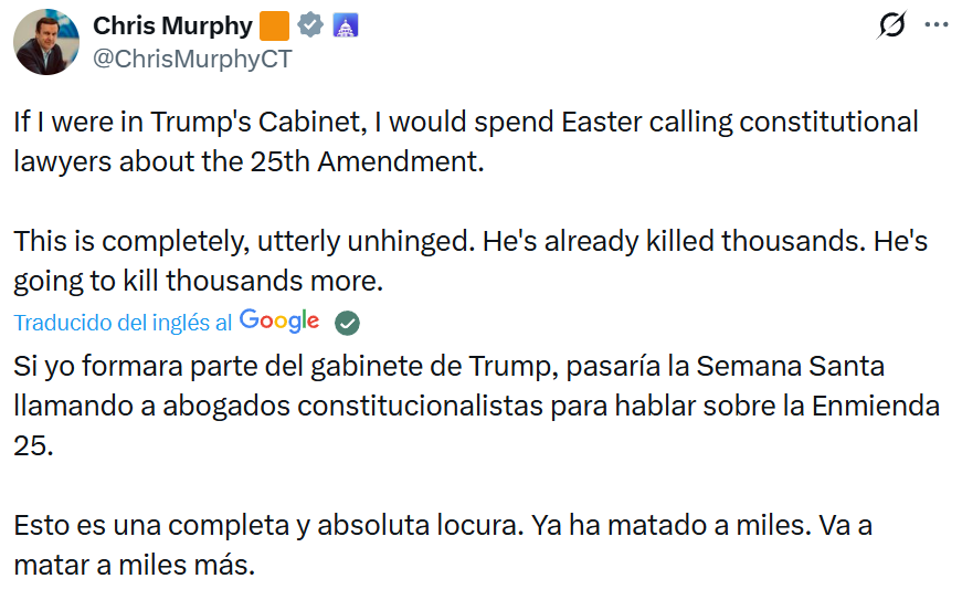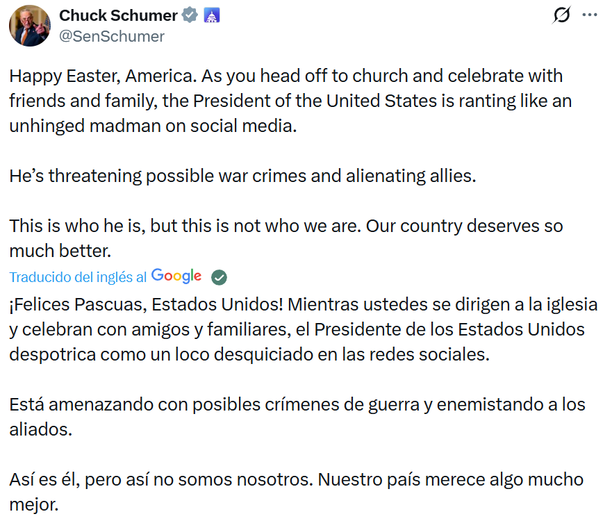 “El martes será el Día de las Centrales Eléctricas, y el Día de los Puentes, todo en uno, en Irán. ¡¡¡No habrá nada igual!!! ¡Abrid el puto estrecho, malditos locos, o viviréis en el Infierno - ¡YA LO VERÉIS! Alabado sea Alá. Presidente DONALD J. TRUMP”